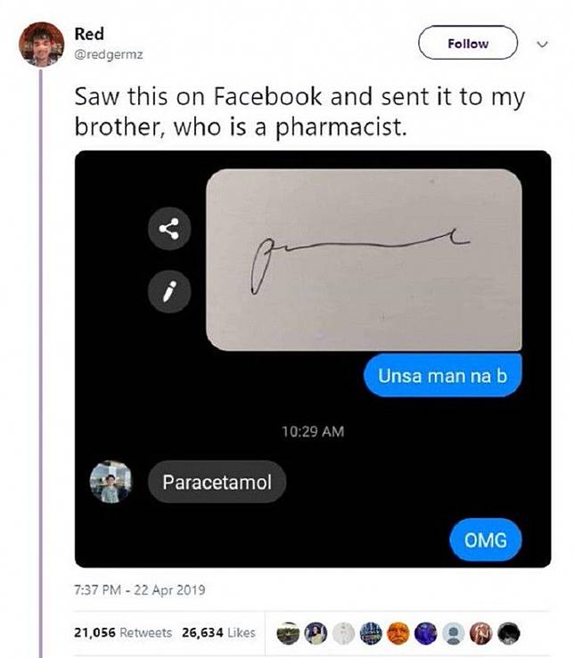 Sontak banyak netizen yang bertanya-tanya dan bingung. Mengapa goresan tangan tanpa bentuk ini bisa diartikan paracetamol? Tidak hanya itu, para netizen pun kagum dengan keahlian para dokter dalam menulis dan mengartikan tulisan “cakar ayam” ini.