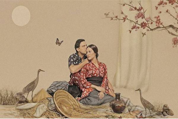 Ide foto prewedding unik lainnya yakni tema lukisan Jepang a la Raisa dan Hamish. Keduanya tampak seperti dilukis dan sedang bersantai memakai kimono.